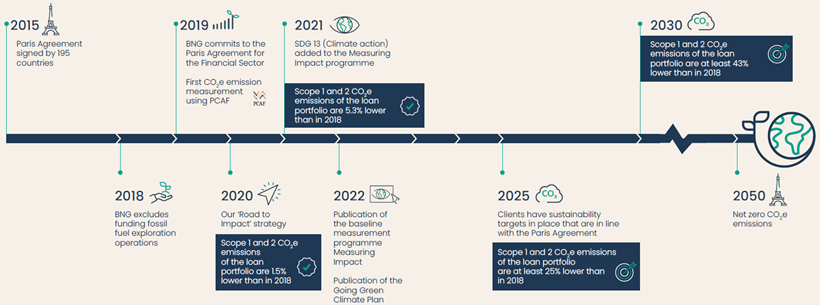 As a next step we published our Climate Plan, ‘Going Green’ (pdf, 14.5 MB), in December 2022, in which we outline how we will work to bring emissions from our loan portfolio and those arising from our own operations in line with the 1.5°C target of the Paris Climate Agreement in the coming years. We will submit our reduction targets to the Science Based Targets initiative (SBTi) to make sure they are tested against the latest scientific insights in the field of climate change.
